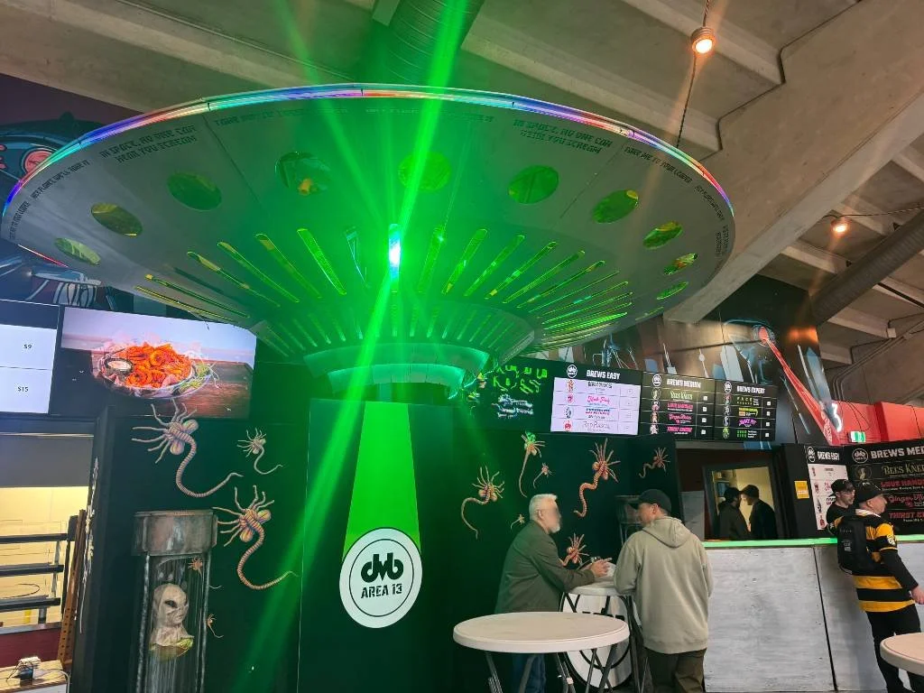 Yes, there were the big flashy ones. Double Vision Brewing’s glowing green spaceship, ringed with alien face-huggers, was hard to miss — as was the neon triangular construct at Mean Doses. Brew Moon Brewery and Cafe brought rustic charm (and a few inflatable sheep that kept wandering off), while Three Sisters kept their criminally good beer locked up behind bars.