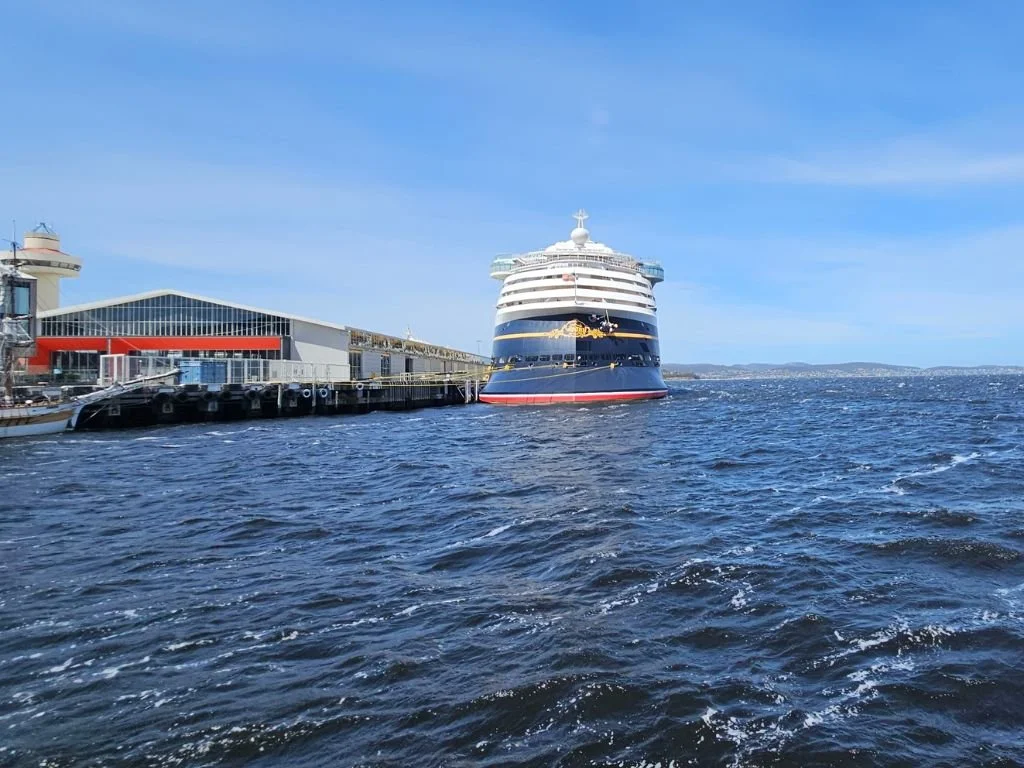 The Disney Wonder sailed back into Sydney Harbour in October 2025 after a two-week crossing from Hawaii. I ran down from the office at lunchtime on that first day to take photos, feeling a flutter when I spotted the funnels as I came down the hill towards Circular Quay. Amy said she felt the same when we returned the following day to take more photos and video under sunnier skies.