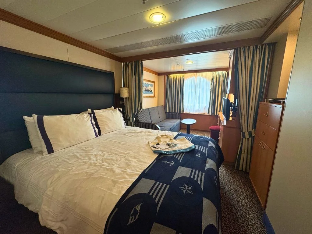 All non-concierge rooms include flexible bedding (queen or twins, with bunks for kids), a sofa bed, TV, plugs for US/European devices, a small fridge, and USB-A ports. There is no in-room kettle, so you’ll have to head up to Deck 9 for that first tea or coffee in the morning.