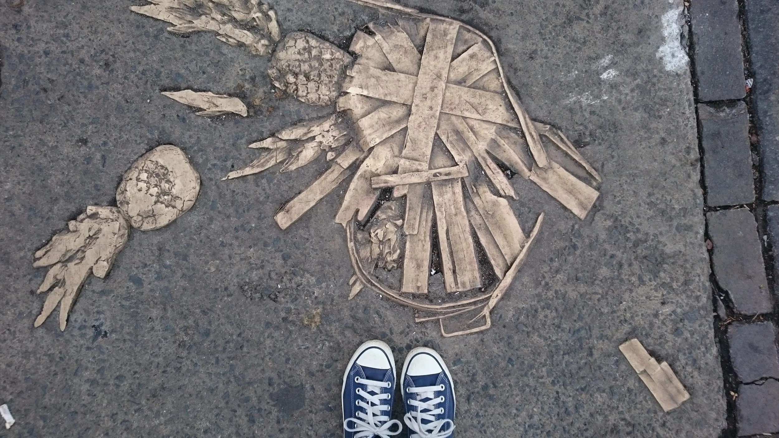 Photo Clue: Bits of bronze fruit and broken baskets embedded in the sidewalk. Was temporarily removed during the 'Big 'Dig'.